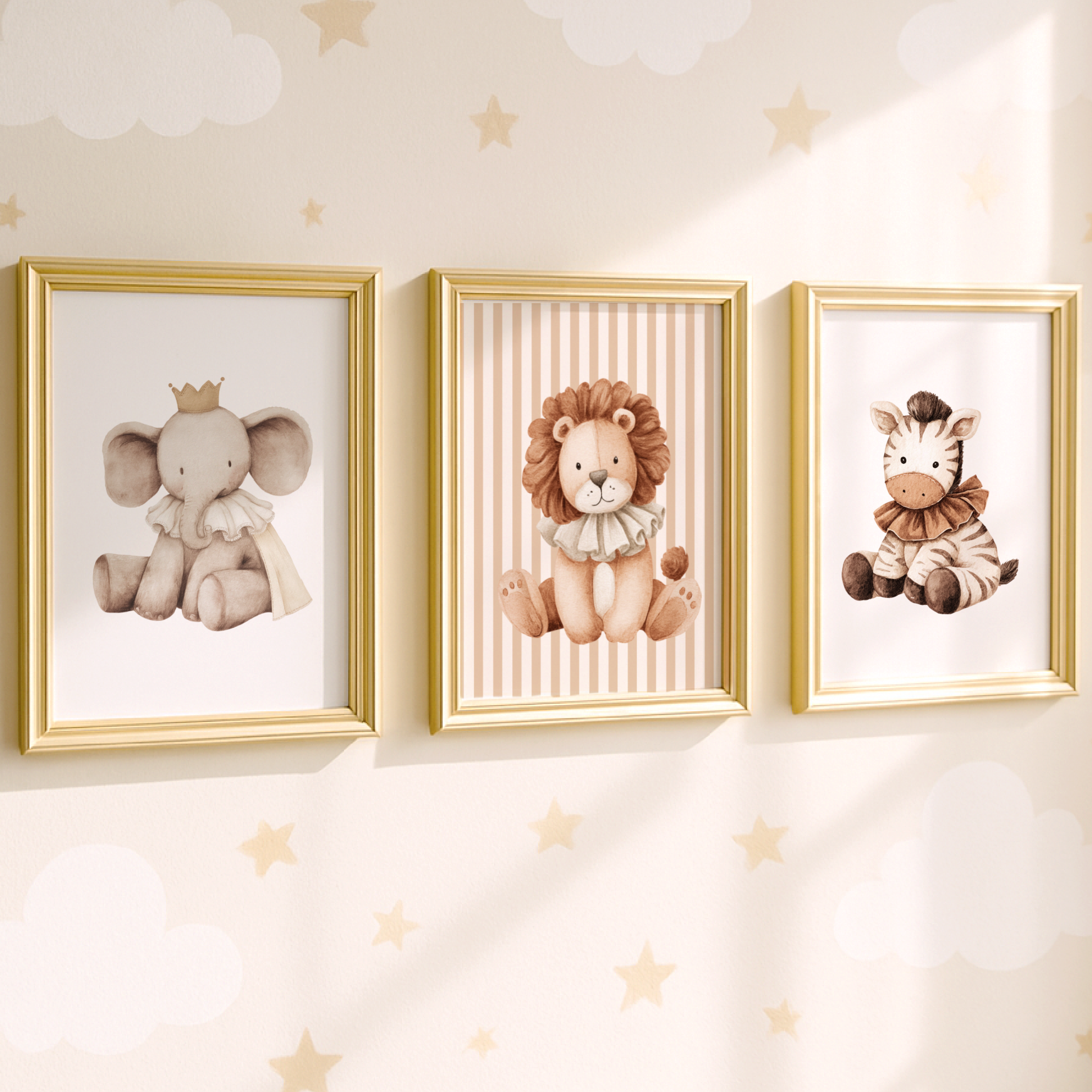 This Adorable animal print set features three beautifully coordinated watercolor designs that bring a soft, playful touch to any nursery or child’s room. Each artwork is printed on thick, fine-art paper for long-lasting quality and beautiful color depth. The soft, neutral tones make it easy to pair with any modern or themed room décor.